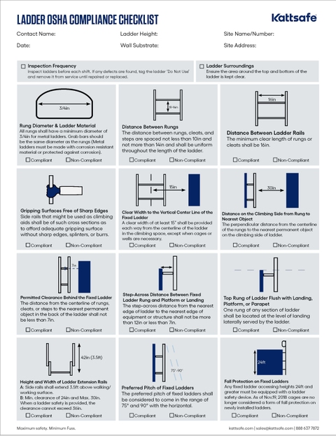 Click on each box of the Kattsafe OSHA Ladder Compliance Checklist to learn more about the importance behind each requirement, as well as the correlating OSHA code it relates to.