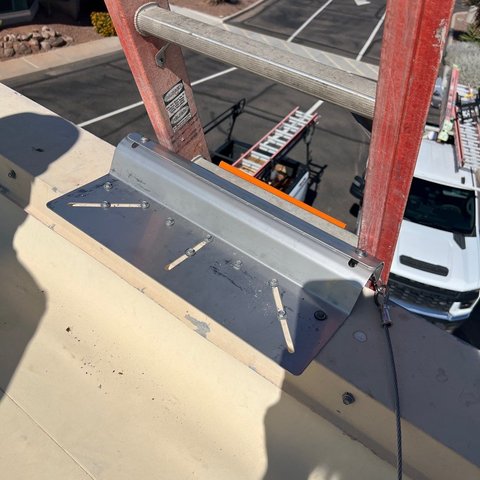 The KD402 Kattsafe Ladder Support Bracket is for mounting to the roof surface. They are designed to provide a secure attachment point for portable ladders when accessing a roof. The support bracket prevents the movement of a portable in any direction. There is a clear, designated, safe roof access area with the ladder support bracket fastened to the wall.
